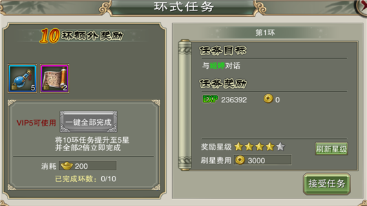 完成环式任务有大量的经验值,而且每天只能完成10个环式任务,所以玩家们每天不要错过此次可以获取大量经验值的机会。