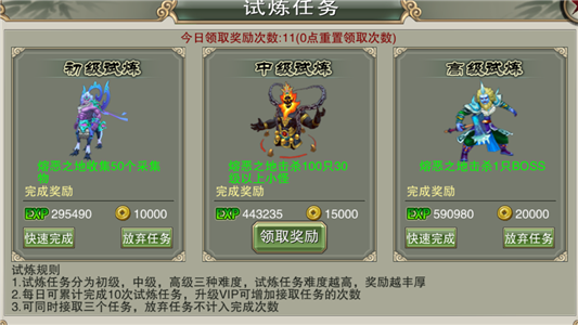 小技巧:VIP等级越高,可增加试炼任务的接取次数越高!可以同时接取三个不同难度的任务。