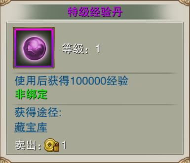 使用经验丹可以获得大量经验值,通过藏宝库抽奖可获得