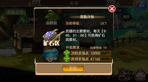 后山的3种资源都是可以升级的,通过点击左上角资源升级,消耗农场点就可以提高等级了。后山资源等级越高可以获得的资源越稀有。