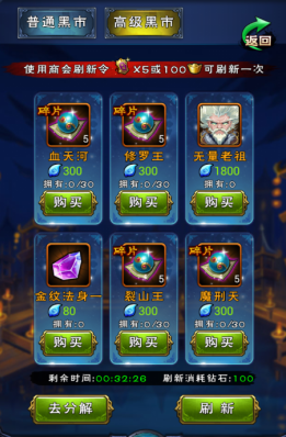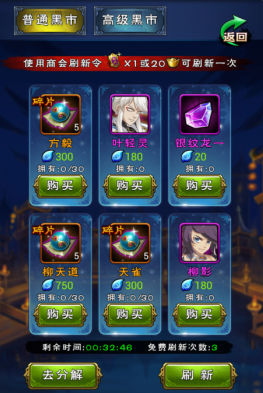 分解得到的神魄可以在“黑市”里购买需要的材料道具、主将碎片或是主将,绿色和蓝色品质的人物只能分解出铜币和灵晶,紫色或紫色以上品质的人物是可以分解出神魄的。