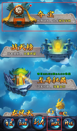 顾名思义,夺宝夺取宝物的意思,在游戏内夺宝不仅仅能够夺取的是一种宝物,其中还有法神宝物和神兽宝物,人物突破可是需要法身宝物和神兽宝物的,并且每个英雄都有对应的神兽缘分和法身缘分,集齐可以激活缘分属性哦。想要变得更加强大,突破英雄,就赶快去夺宝吧。