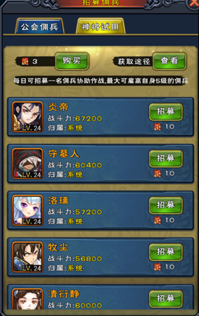 金币不够怎么办?没有元宝买怎么办,请看至尊秘藏,大家不要认为至尊秘藏就是传统意义上的金币副本,只要通关至尊秘藏不仅仅可以获得海量金币,还可以获得元宝和关卡连战符(给元宝的金币副本你们见过么? 给元宝的金币副本你们见过么? 给元宝的金币副本你们见过么? 重要的事情说三遍)当然至尊秘藏是需要消耗耐力的哦,每次2点耐力扣除,如果打不过对方怎么办,不要怕,我们给玩家提供了超强的佣兵系统,佣兵也分为两种,公会佣兵和神将试用加了工会的小伙伴可以选择工会里面大神玩家来助战哦。如果想体验超五星神将的玩家可以在9个超五星神将里面选择一个进行助战。雇佣工会佣兵和神将都是需要消耗佣兵牌的哦(佣兵牌可以直接购买、公会每日高级/中级建设、每日任务130积分宝箱、工会商城每日购买)
