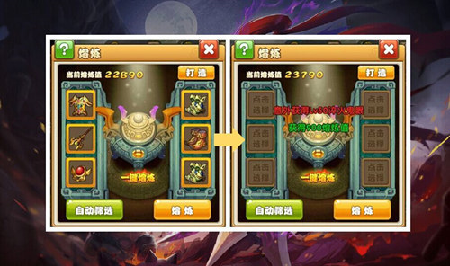 熔炼炉一次可以投入6件装备,熔炼后产出0-4件高一阶的装备,同时获得一定的熔炼经验,值得一提的是橙装投入熔炼炉后,会获得有额外属性百分比加成的神器哦!全身神器不再是梦!