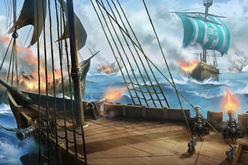 在海上场景的概念图中,海面风平浪静,而暗蓝色的主色调与海盗船都昭示着这只是暴风雨的宁静, 海上战争一触即发。无论是天空的流云,还是海面的波纹与倒影,都体现了美术团队在细节处的用心。尤其需要强调的是海面上的战船,1:1还原历史上的名舰,从细节处真实还原大航海的时代背景,增强玩家的代入感。