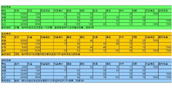 每种集齐3种就可以触发套装特效。在现在的版本里武神装备特效触发效果不是很好,那么武神装备是不是和人物装备一样可以混搭呢?答案是可以的。各位猫咪们都知道,武神越抗打,越血厚,那么它们就可以为战斗中的你提供持续的稀有技能效果和buff增益,而除了哪吒以外,相信没有人会想去用武神打人,所以给武神装备要点就是血厚,减伤,爆免,伤害减免。而上述武神套装的减伤,还有伤害减免都在项链和戒指上,并且数值是一样的,那么就要考虑其他两个因素,血量和爆免了。