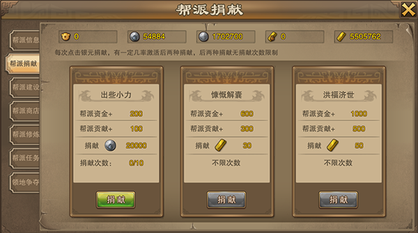 帮派捐献有银元和金条捐献两种,银元捐献是默认开启的捐献方法,金条捐献是银元捐献之后随机触发开启的。如果触发了30金条捐献,使用30金条捐献则有几率触发50金条捐献或者只剩银元捐献;如果触发了50金条捐献,使用50金条捐献则有可能触发30金条捐献或者只剩银元捐献