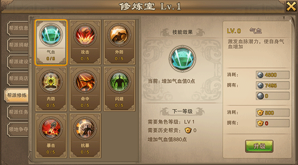 在修炼室可升级帮派技能来提升战力,帮派技能可升级等级由帮派修炼室等级来决定,升级帮派技能消耗帮贡和银元