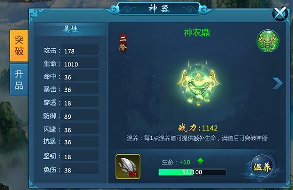 想要突破神器,必须先温养神器,而温养可为角色提供大量的生命属性。