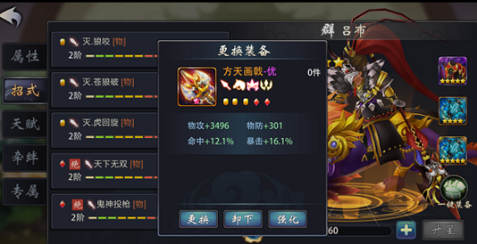 当然,像吕布这样的猛将,招招炸天,必须得配上招式全开的武器,诸如方天画戟神马的。另外,游戏中大部分橙色武器招式全开。令人意外的是,作为紫色装备的麒麟弓,虽然攻击力不是特别突出,但它却可以解锁全部招式,大家快去收集吧!