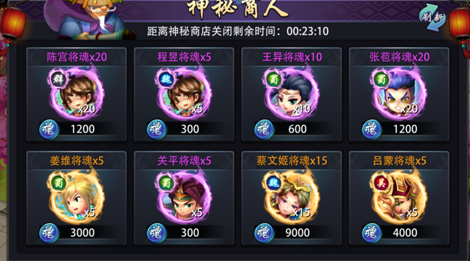 大家可以看见,神秘商人贩卖的都是稀有的紫将和橙将碎片,而购买这些碎片所需要的不是元宝,而是魂币。大家可以把不用的武将分解换成魂币,用来在神秘商人那里购买需要的武将,祝大家早日组成理想的阵容。