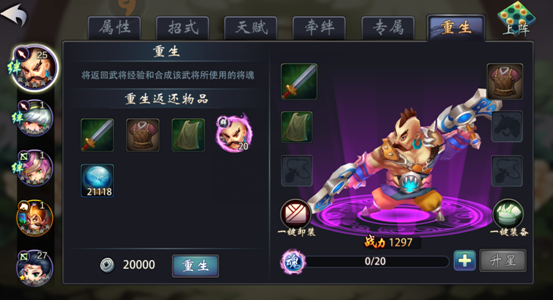 武将重生可以将武将返还成碎片状态,升星所消耗的碎片也全部返还,并且还能够返还武将的装备,等级所花费的经验,使用的学习证等各种花费在武将身上的物品也将得到返还。但是请注意一点,重生需要消耗一定量的银币,返还的的东西越多,消耗的银币也就越多哦。
