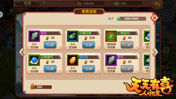 家族宝库可以用个人贡献值来购置一些家当,族长和族员通过家族建设来增加个人贡献值,在家族宝库里有很多你别处寻不来的宝物,而随着家族的日益昌盛,宝库宝物也会与日俱增。