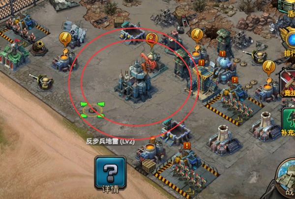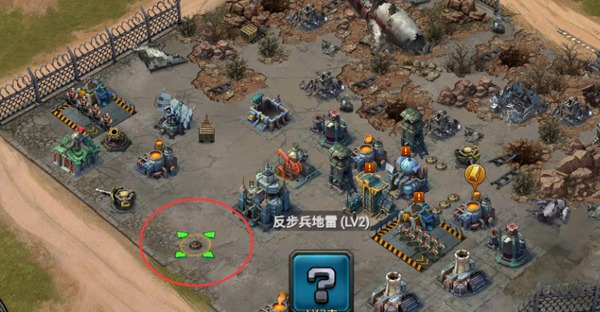 比如这个地雷,将它故意放在距离建筑的前方适合的距离,如果敌人要攻击建筑必然在这个地方停下来,然后被地雷爆炸造成伤害。