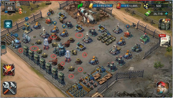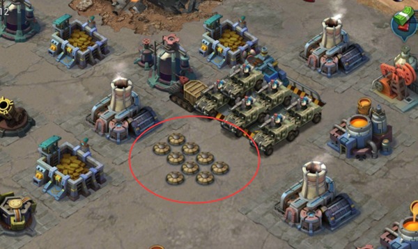所以地雷更多的使用方法是,将地雷摆放在各个必经之地。真正进行战斗时由于选择自动战斗的原因,输出单位在摧毁一个建筑后自动寻找下一个单位前往攻击。这个时候就由于战斗画面的混乱,敌人很难注意到,而在移动的过程中就是地雷大显身手的时候了。