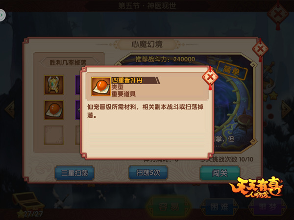 仙宠除了升星能够提升战力以外,晋级也是很重要的,仙宠晋级需要消耗一定的铜钱和晋升丹,相对于较易获得的铜钱而言,不同等级所需的晋升丹较难获得。游戏中晋升丹主要在主线副本中产出,也可以到神秘商店和奇珍商店中购买,家族宝库中可以用贡献值进行兑换,宝库等级越高,能兑换的晋级丹等级越高。除了以上渠道,日常任务、活动内容中也会有一定的晋升丹奖励。