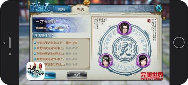 不仅是情缘,阵法更是阵灵系统的重要部分。《诛仙手游》的每个阵法有3~6个阵位,每个阵位可上阵一个阵灵。若嫌阵位太少,难以发挥实力,可以选择“扩阵”提升阵位数量。阵法的属性激活根据上阵阵灵的最低品阶决定,可为你额外提供属性。有了这样一个可策略搭配,随时调整的百变阵法,你的战场将从此势如破竹,再无人可挡。