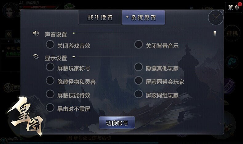 在系统设置界面,可以进行音效音乐的关闭开启和音量调节,还可以进行显示方面的设置,包括屏蔽玩家或称号、特效等,同时也可以返回登录界面切换账号和角色。
