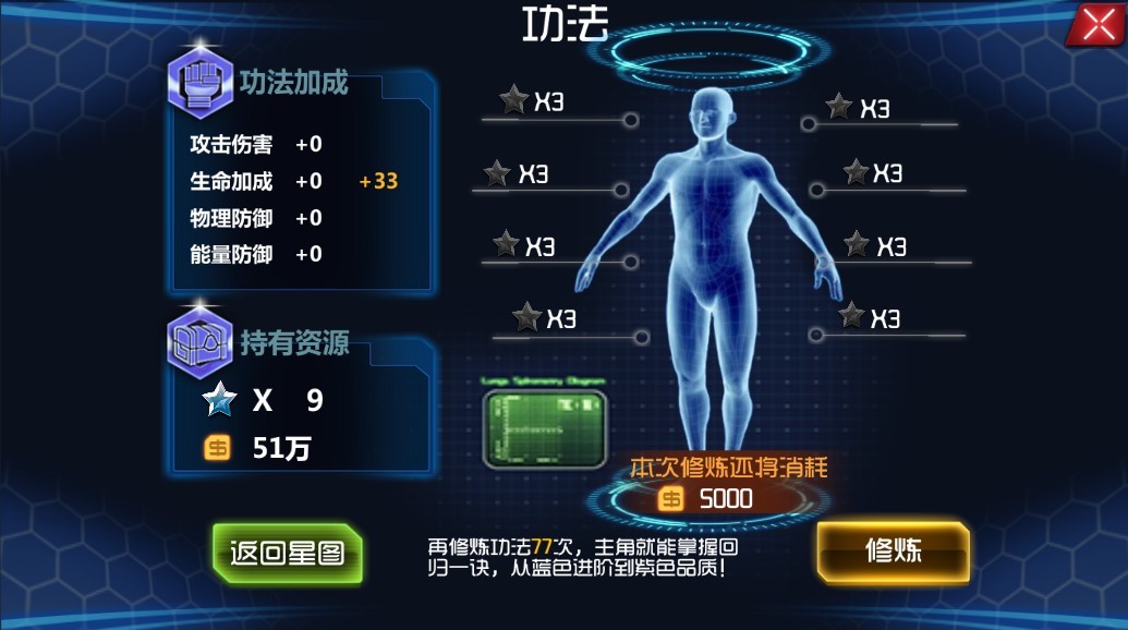玩家通过剧情战斗可以获得星星,花费3颗星星以及相应的银河币可以修炼一次功法,功法可以提供玩家主角伤害,生命,防御方面的加成。功法修炼到一定阶段,可以使主角的品质提升由蓝色变为紫色。所以玩家需要不断的从剧情战斗获得更多的星星来修炼功法。