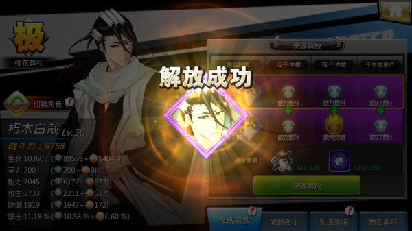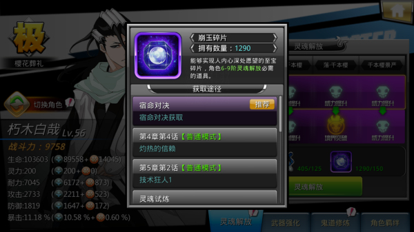 期的升阶较为轻松。进行高阶的灵魂解放所需的“崩玉碎片”由于需求量较大,则需要玩家多去扫荡关卡(推荐“精英关卡”);最难获取的