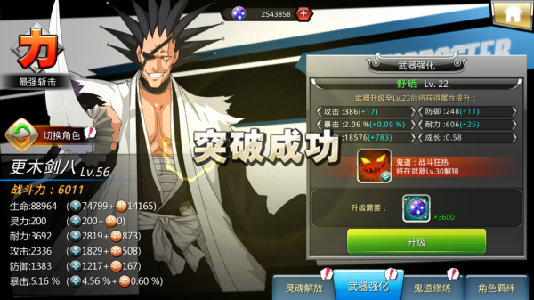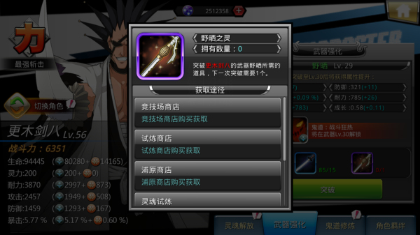 每逢10级的武器强化会需要特殊的突破道具,前期武器强化需要浅打之灵和部分灵子,通过成就奖励和平时通关所得的材料能够轻松完成强化,而后期的武器强化则需要角色对应的武器之灵,例如“黑崎一护”武器突破需要“斩月之灵”。 许多角色的武器之灵可以在其对应的精英关卡通关奖励中获得各商店也会随机出售,所以平时在商店中遇到了千万不要错过。武器强化时灵子不够怎么办?别忘记了番队的助战功能,还有每日的地狱蝶活动,灵魂试炼闯关等,这些都是能够获得海量灵子的地方