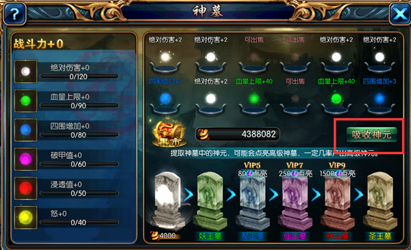 1.每次吸收神元前,最多可以点亮12次神墓。12次点满后点击“吸收神元”既可看到战力得到大幅提升!