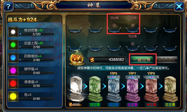 2.不是所有的神元都能够被吸收,这时则需要将不能被吸收的神元出售。点击“一键出售”之后可以得到出售神元的铜币收入并清空占位
