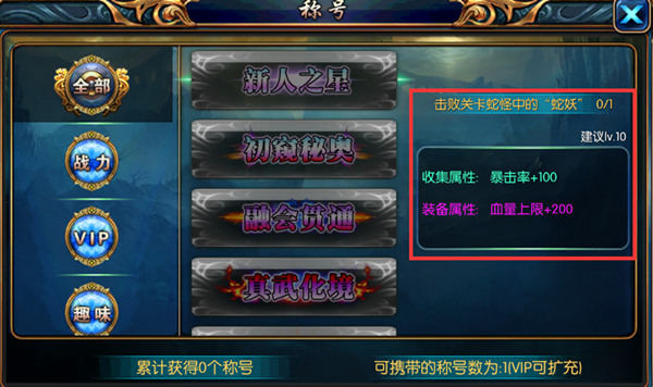 随着VIP等级的提高,角色可佩带的称号将越多