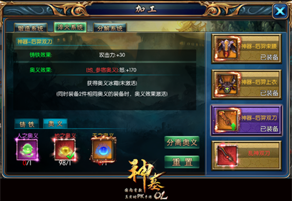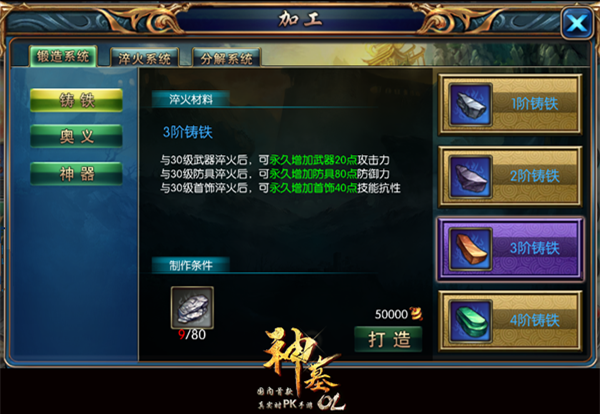 游戏中加工包括铸铁、奥义和神器,昨天讲了神器,小伙伴们应该都清楚了,今天要讲的就是提升装备属性的另外两个重要方式——铸铁和奥义!