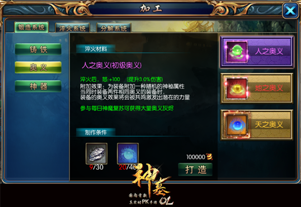 接下来讲奥义,奥义分为人之奥义、地之奥义和天之奥义三种,奥义有两个效果,一个是直接附加属性【怒】,第二个是附加效果,只有当同时装备两件相同奥义的装备时,才会激活。制作奥义需要消耗【碎铁】和【奥义灰烬】两种道具,越是高等级的奥义,消耗道具的数量越多。