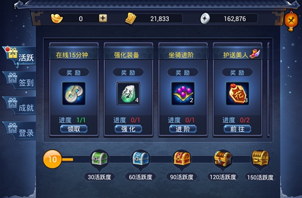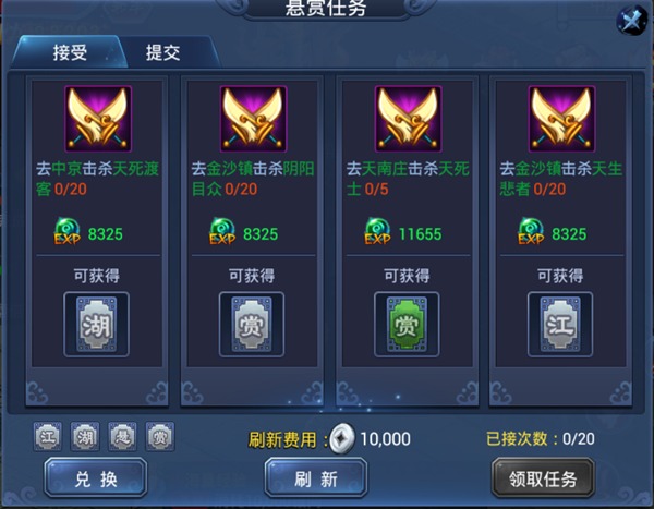 每日都会刷新20次悬赏任务,悬赏任务分为白、绿、蓝、紫、橙五个等级,悬赏等级越高,完成任务获得的经验越多。玩家可以通过免费刷新或者银币刷新的方式选择自己想要的任务等级,完成之后可以得到大量的铜币奖励,另外每日任务也是玩家初期升级的主要途径。