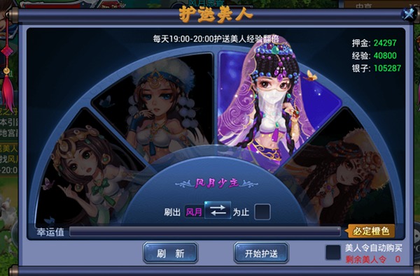 通过到风月总管处领取护送美人的任务,四种美人任你选择,名号越响铜币自然越多。在护送期间保护美人不被歹人所劫安全到达目的地,即算完成任务。