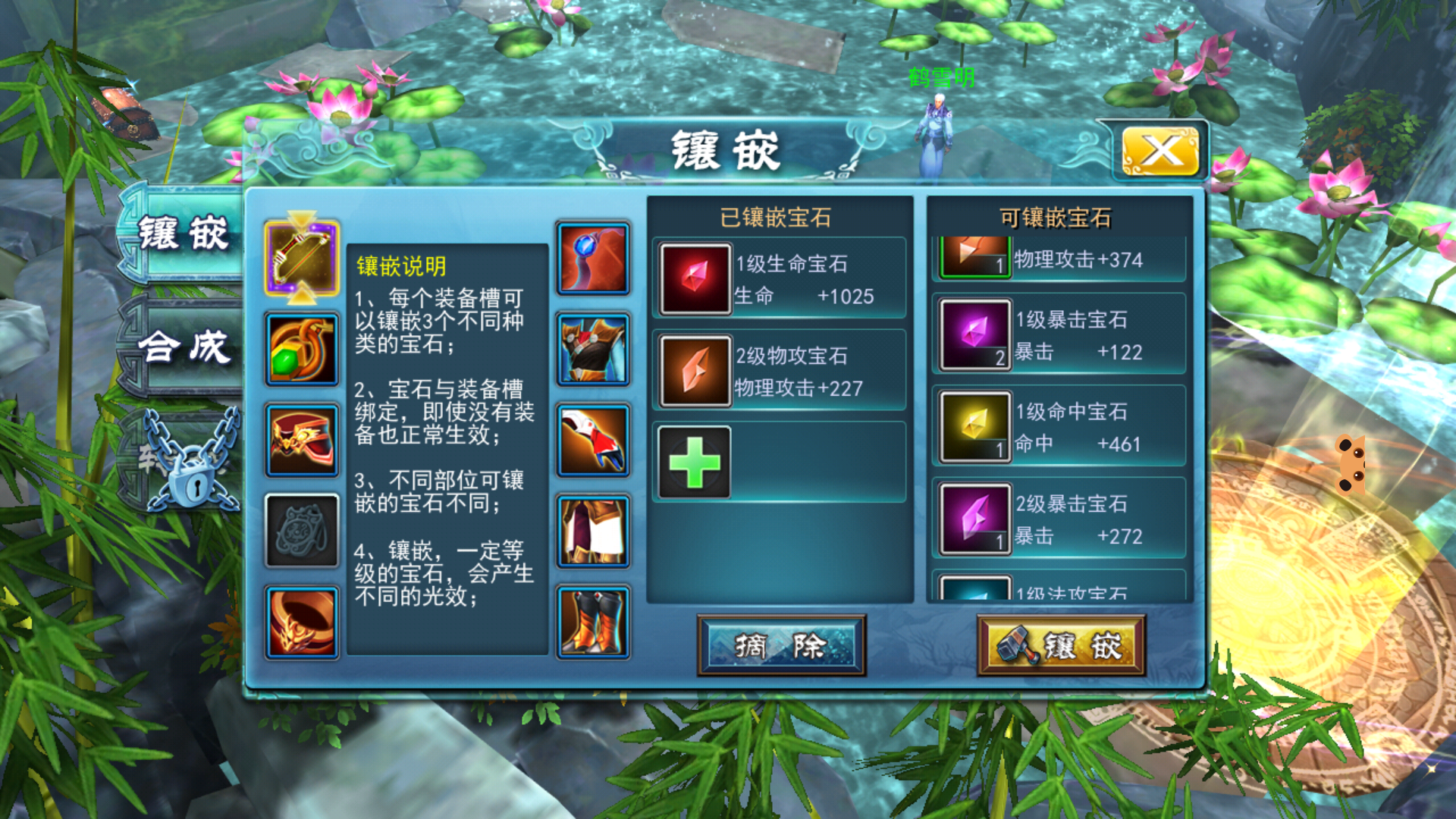 游戏内镶嵌不同的宝石可以为角色提供相应的属性加成。其中物攻、法攻、命中、暴击、生命等宝石可镶嵌在武器,护符,腰带,项链,戒指等装备部位上,物防、法防、暴抗、闪避等宝石可镶嵌在帽子,衣服,护腕,裤子,鞋子等装备部位上。玩家无论是否穿上装备,都可以在每个部位打上宝石。在没有穿装备的情况下,每个部位所装备的宝石也可激活效果,且宝石可随时镶嵌摘取。