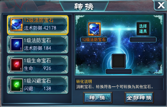 消耗宝石转换符,可将宝石转换为同级别的其他类型宝石,当你感觉目前的宝石不太给力的时候,不如试试换一种宝石吧~