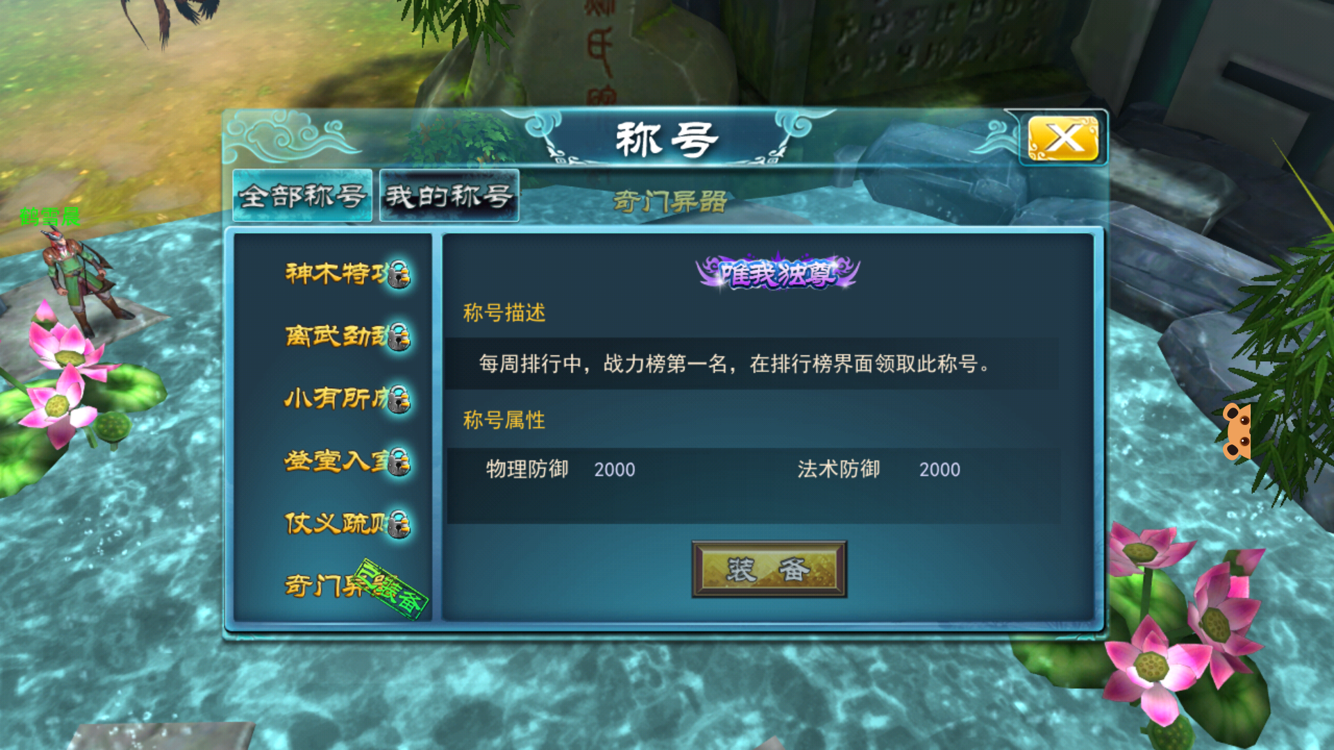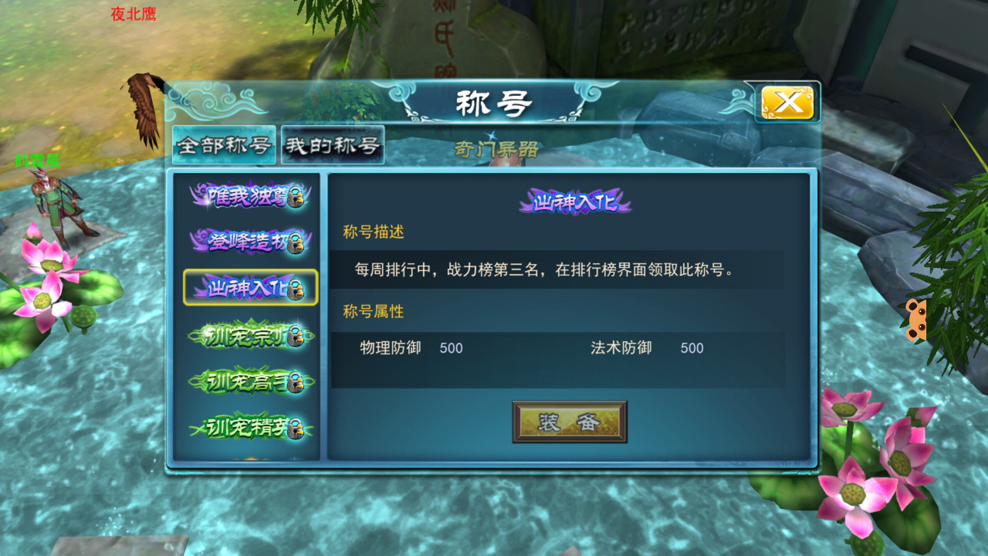 点开装备称号界面之后,就可以较为直观的查看称号的信息了。称号系统界面分为全部称号和我的称号两部分。全部称号栏里可以查看全部称号的获得方式和称号属性,同时已经获得的称号会显示已装备,未获得的称号会被一把小锁锁住且无法装备,各位收集控们要努力啦~我的称号栏里则是已收集称号的集合与汇总,操作起来也是十分的方便。