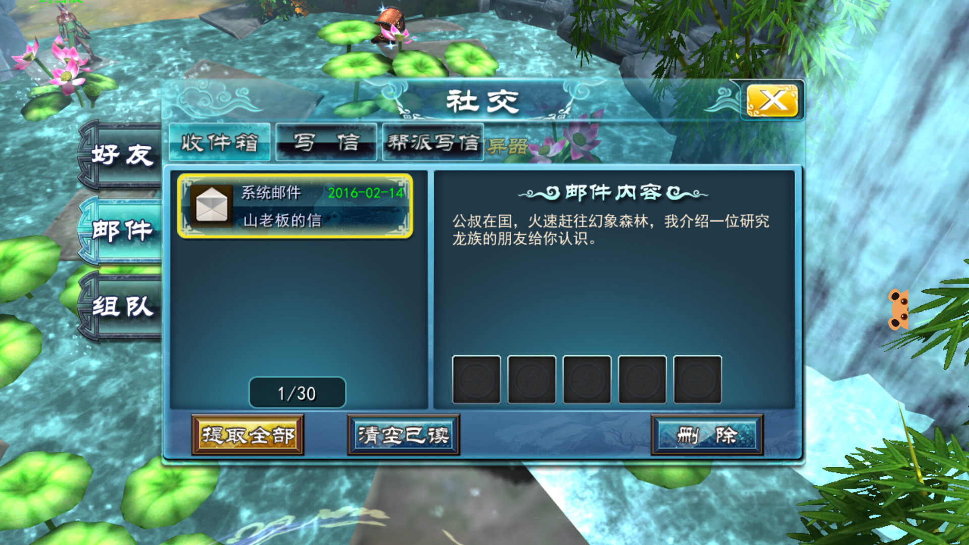 游戏内可以随时给好友写信,并且收到信后可以在收信箱直观的看到邮件内容。当收到有附件的邮件时,点击提取全部选项就可以一键提取全部附件啦!