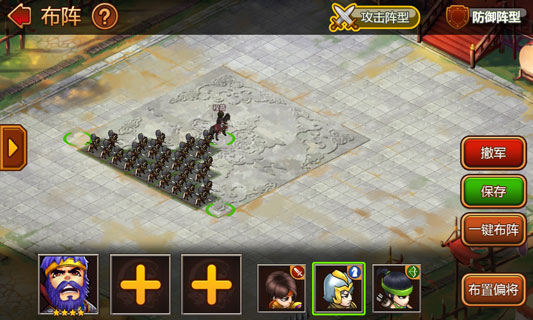 优方案::全骑兵,由于骑兵有着比武将更快的速度,会逐渐超过武将。整个阵形攻击很集中,全在阵型前端。配合勇士武将的攻击伤害技能,能迅速撕开对方的防御,靠攻击取得胜利。