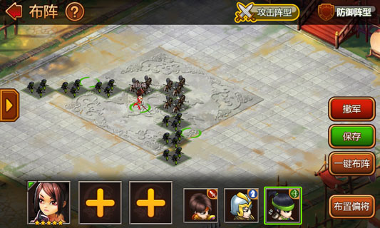 优方案:前方少量骑兵,后方大量弓箭手。前方少量的骑兵超过武将后,首先突入对方阵型,后期勇士型的武将提供大量普通输出和技能伤害,后方的弓箭进行持续稳定的伤害。
