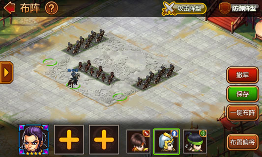 阵型特点,利用统领型武将可带兵力较多,兵力充足的特点,从左右包围对方阵型。