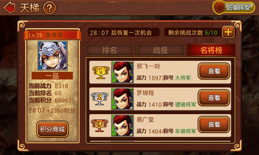 大家只能挑战自己前5名和后5名的对手。挑战栏能看到对方发放的积分情况和排名,且能看到对方的防御阵型中的主将的头像,以及他的总战力。点击挑战按钮则进入挑战界面。