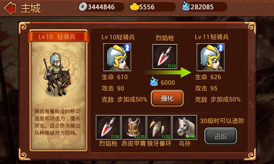 点击主城后可以进入强化兵种界面,强化框左边会显示当前士兵的属性和强化后士兵的属性。强化需要消耗武魂和兵种道具,点击强化按钮,就可以对士兵进行升级,如果当前拥有的武魂或者道具不足,武魂会以红色显示,点击强化按钮后,会提示“主公,武魂(道具)不足。如果武魂和道具充足,点击强化按钮以后,该兵营的该兵种完成升级。