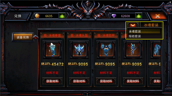 进入兑换装备界面,右上方可以选择套装,当你集齐碎片之后,记得来兑换!