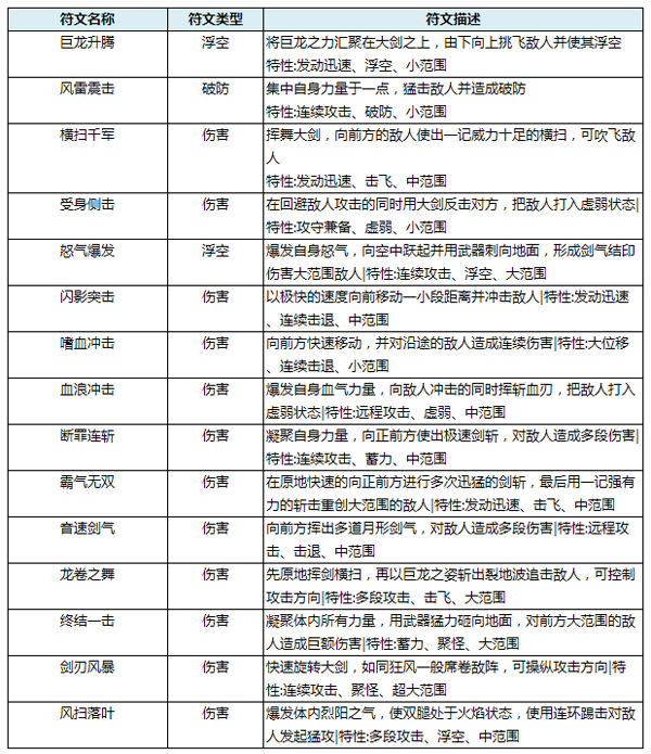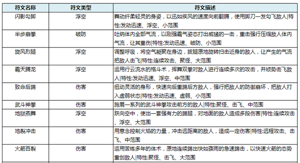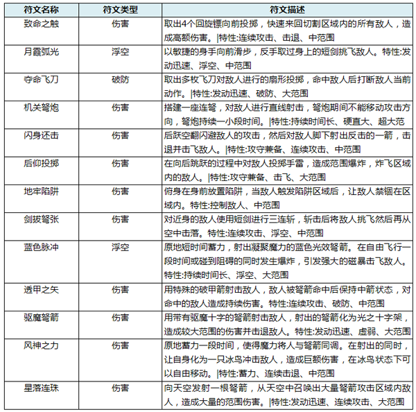 符文的类型:浮空,破防,伤害。符文升级:使用金币即可升级符文,符文等级越高效果越高。符文星级:符文星级越高越牛逼,最高为5星,最低为1星。在藏宝阁中探宝可获得符文或符文碎片。符文是不能升星的。符文进阶:当符文升级到一定等级,需要进阶来突破升级上限,进阶需要“符文进阶卷轴”。符文有组合技,携带一套组合技出战可额外激活一种技能哟。更详细技能描述请查看以下表格:
