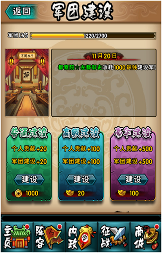 玩家可以通过使用金币或者元宝进行建设帮会,建设后可以获得个人贡献和军团建设值!个人贡献可以在商店中购买各类物品哦!