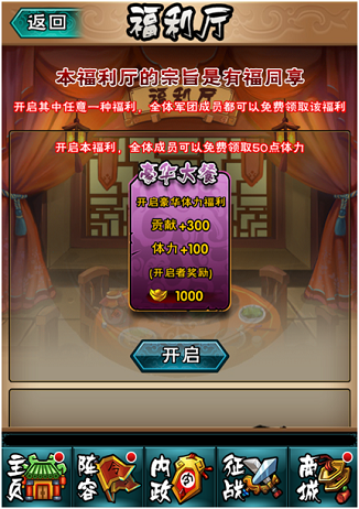 在福利厅中如若有玩家开启了福利,那么全体军团成员都可以领取福利,抱大腿的时候到啦!