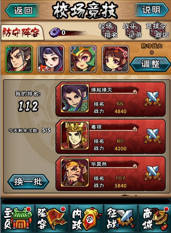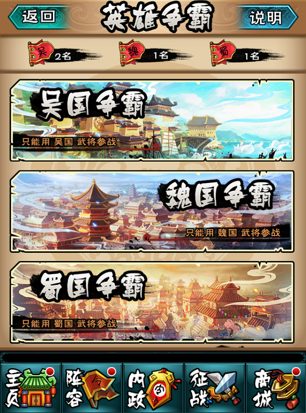英雄争霸是分为三国模式,每个国的争霸只能上阵对应国别的武将,如吴国争霸,玩家只能上阵吴国的武将。挑战模式与校场竞技是相似的,挑战获胜后可以抢占对方的排名,是极具挑战性的PVP玩法。