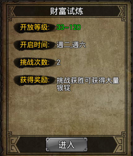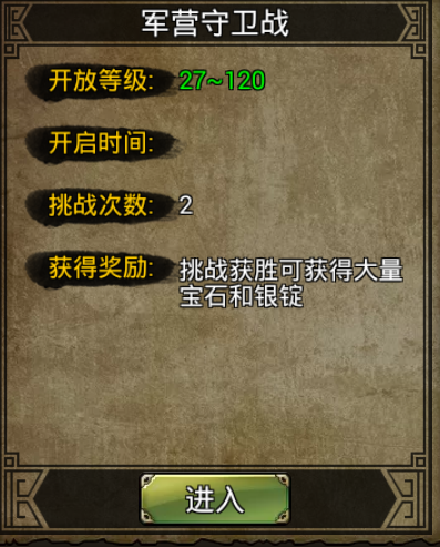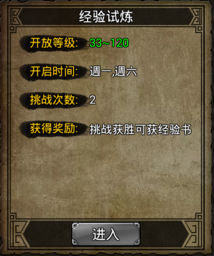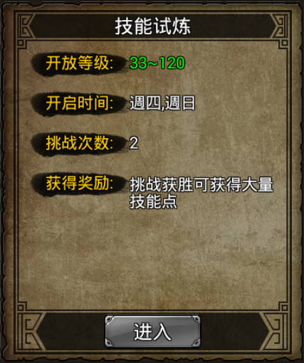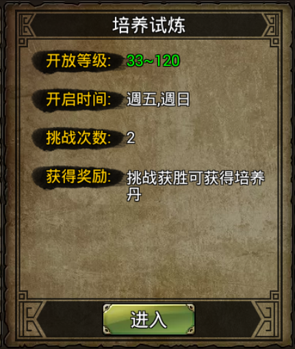试炼副本,是由军营守卫战、培养试炼、技能试炼、经验试炼、转生试炼、财富试炼组成,其中军营守卫战为每天开放。军营守卫战27级开放,五大试炼为33级开放。