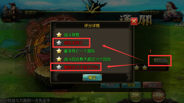 相信大家再过副本的时候,都会格外注意注意是否5★过关。这里给大家个小技巧,当大家过完副本的时候,会弹出个胜负判断界面,在这个界面里。会有个星级判定,旁边就会有个评分详情,点开之后就会看到那些星星是已获得,那些是不达标的~