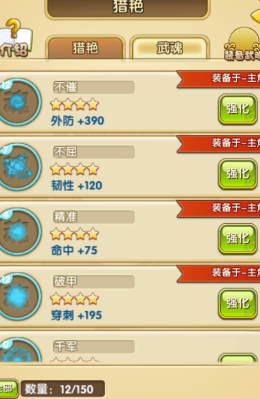 还有就是猎艳,获得武魂,这也是不需要花费元宝的,只要你有足够的铜钱就可以了(铜钱在哪里获得请参考其他攻略),猎艳十连,可以获得很多武魂,白绿蓝都有,这些武魂可以被强化,然后装备到人物上提升战力