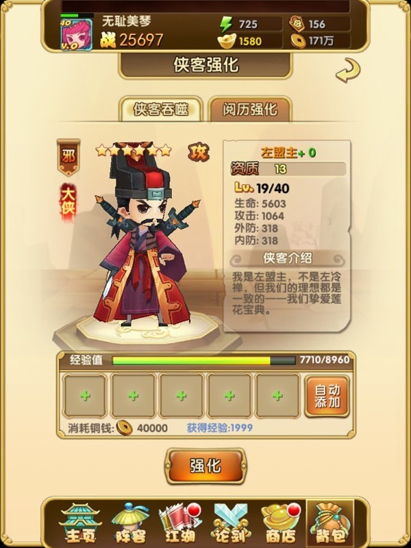 侠客强化:游戏中,侠客卡牌可以通过强化来升级,侠客强化有两种方式,一个需要侠客吞噬,用侠客卡牌或者侠灵,让侠客变得更为强大,另一种是阅历强化,阅历强化需要阅历和大量的金钱,到达一定值后就会升级。